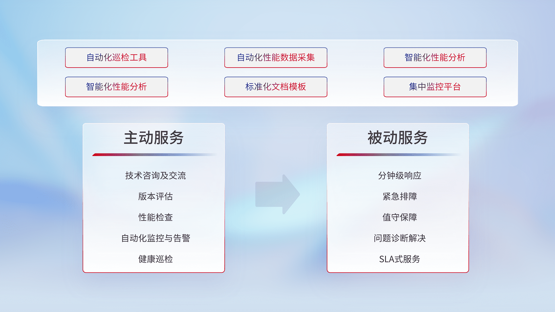 智能化工具和标准化文档,,,,保障服务质量,,,,提供主动服务(包含技术咨询、、、、版本评估、、、、性能检查、、、自动化监控与告警、、健康巡检)和被动服务包含(分钟级响应、、紧急排障、、值守保障、、、、问题诊断解决、、、、SLA服务)。。