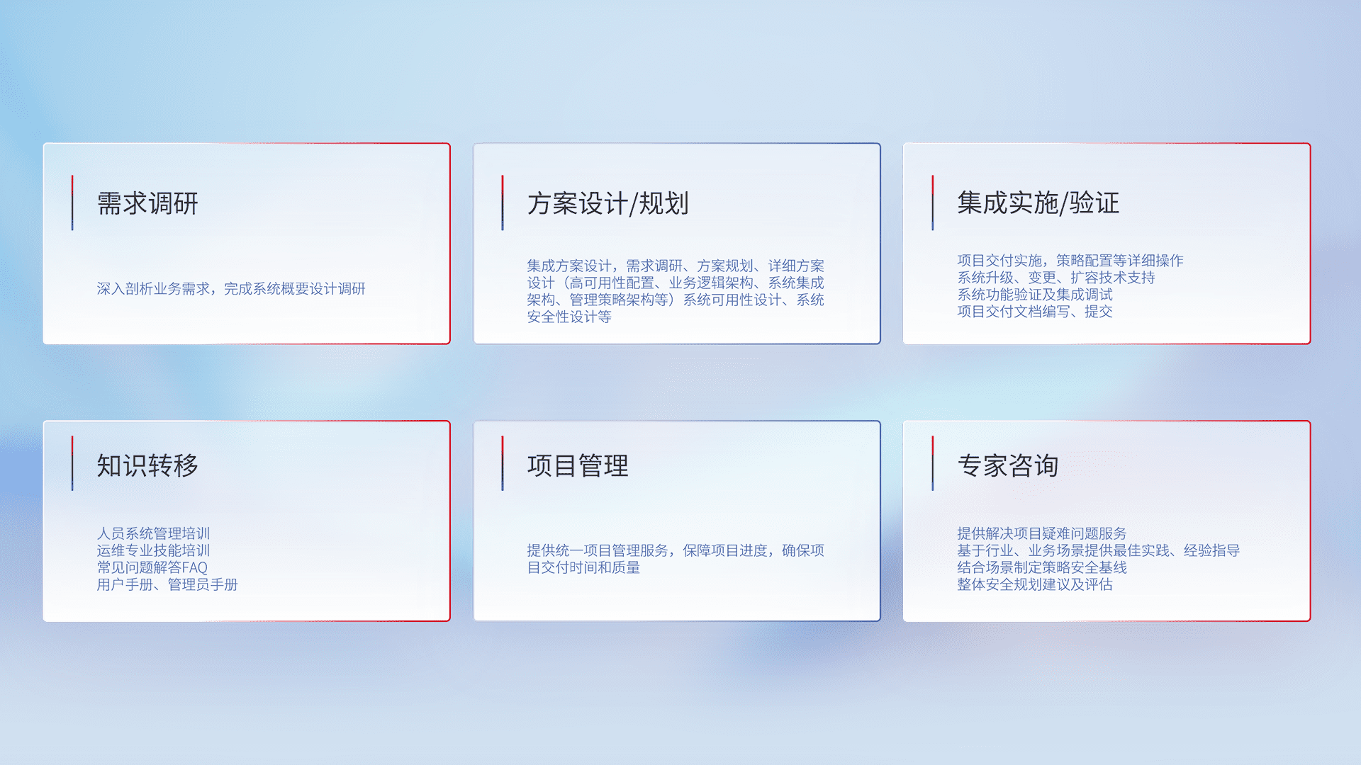 针对客户行业特性,,,,将宏观的安全战略和需求,,,,通过专业的交付服务,,实现项目落地,,,为客户提供标准规范的集成交付服务。。。